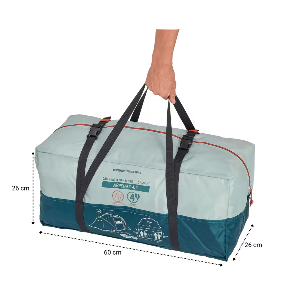 Tienda de Campaña 4 Personas Quechua Arpenaz 4.2 con capacidad nominal para 4 personas y distribución interior de 2 habitaciones separadas. La nomenclatura 4.2 corresponde a una configuración de 4 plazas y 2 compartimentos interiores. La estructura utiliza varillas y el montaje se realiza mediante ensamblaje manual con piquetas y vientos. El conjunto integra doble techo, habitaciones interiores, suelo y funda de transporte. Los tejidos del doble techo y de las habitaciones son de poliéster; el suelo es de polietileno y las varillas son de fibra de vidrio. Dispone de puertas con cierre y aberturas de ventilación. Es un modelo de la línea Arpenaz de Quechua dentro de la categoría de tiendas de campaña.