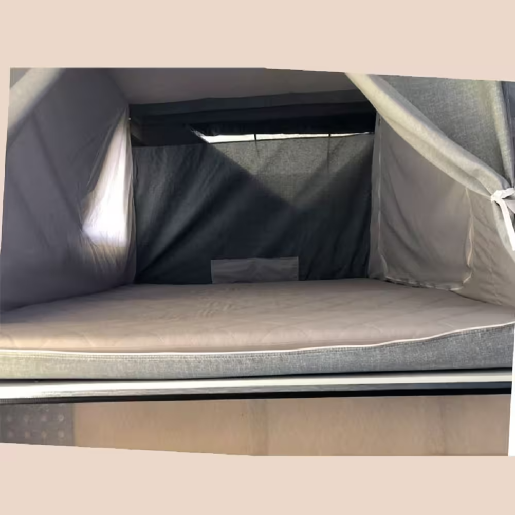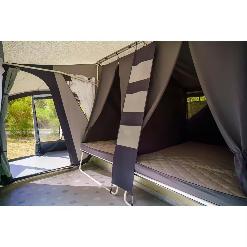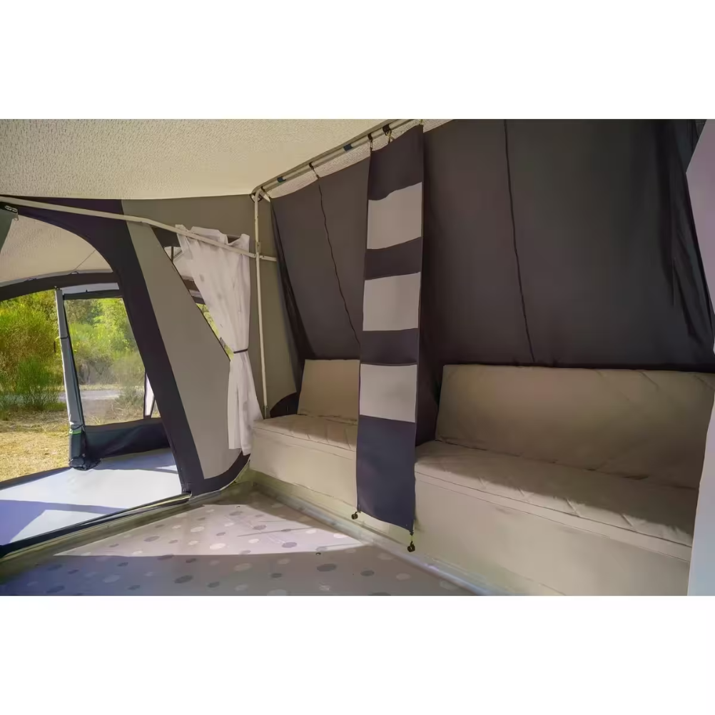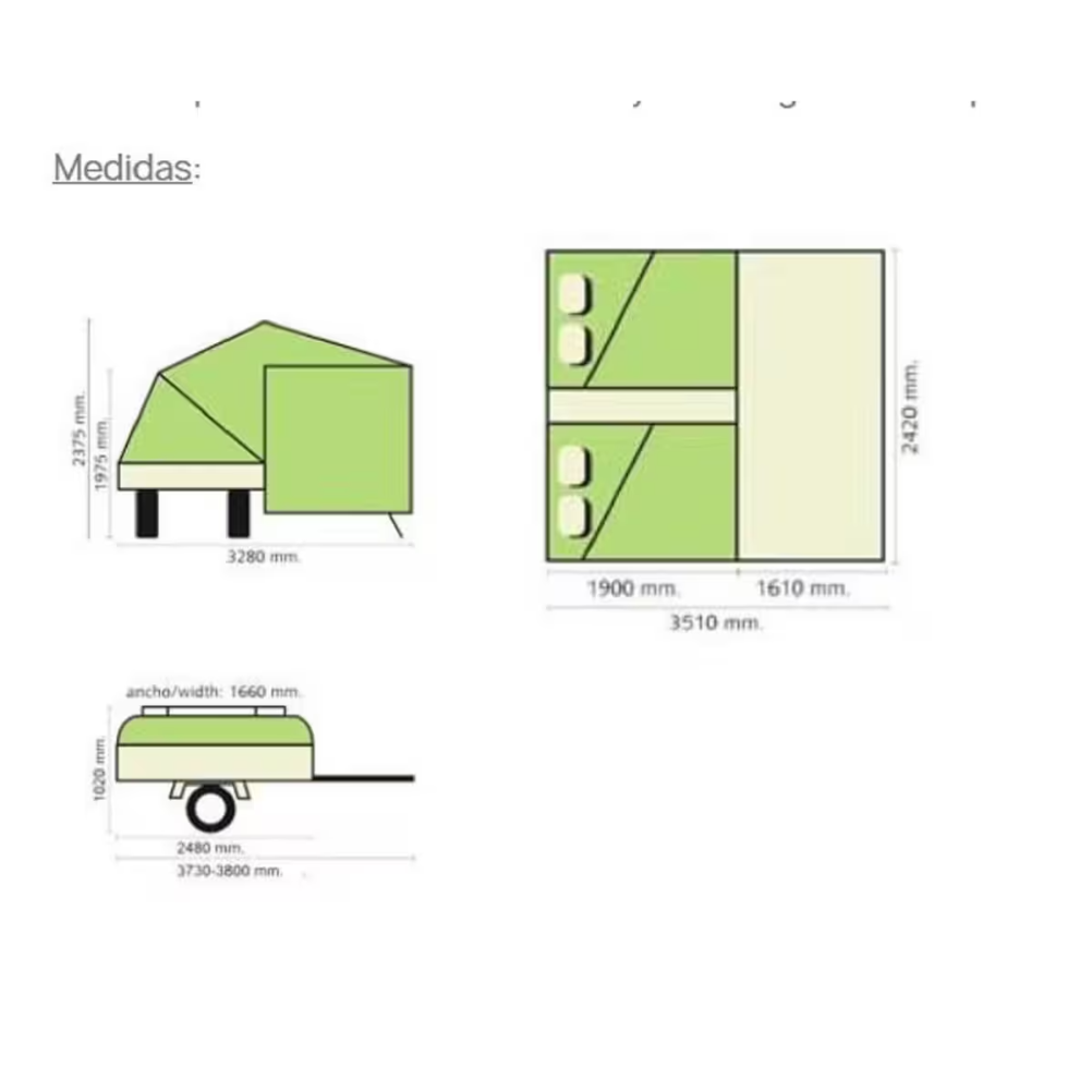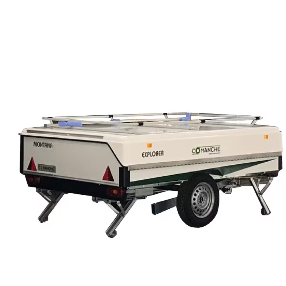 Remolque tienda Comanche Montana con capacidad nominal de 4 personas. Formato plegable montado sobre remolque, con módulo textil que se despliega desde la base de transporte. El conjunto incorpora bastidor de remolque, estructura de soporte para la tienda, lona textil y elementos de fijación para el montaje. La apertura transforma el remolque en una tienda con plazas de descanso y la base cerrada permite el transporte del conjunto cuando no está desplegado. El nombre comercial incluye la denominación Ten Cate y la serie Montana dentro del catálogo de Comanche. Se trata de un remolque tienda de 4 plazas, con configuración de apertura sobre remolque y almacenamiento integrado en la unidad cerrada durante el transporte.